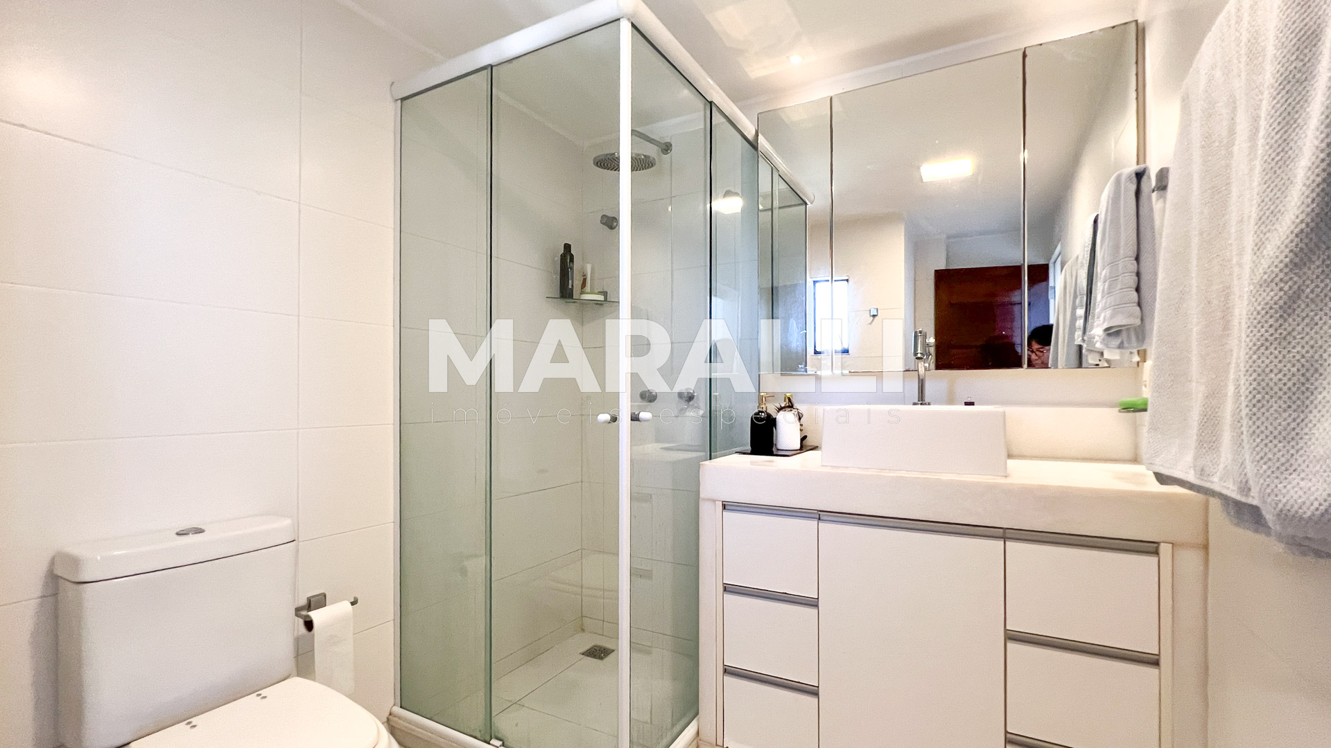- Banheiros com bancadas em mármore branco importado.